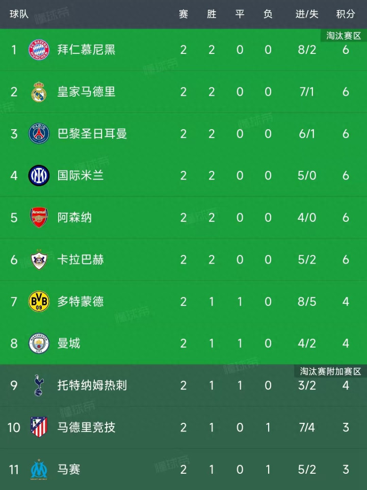 英超球队只有阿森纳收获两连胜,本轮2-0战胜了奥林匹亚科斯,马丁内利和萨卡破门,这2场比赛,枪手和国米一样都是0失球。曼城在客场2-2和摩纳哥战平,哈兰德梅开二度,冈萨雷斯在最后时刻犯规送点,戴尔点射绝平,曼城1胜1平积4分暂列第8名。