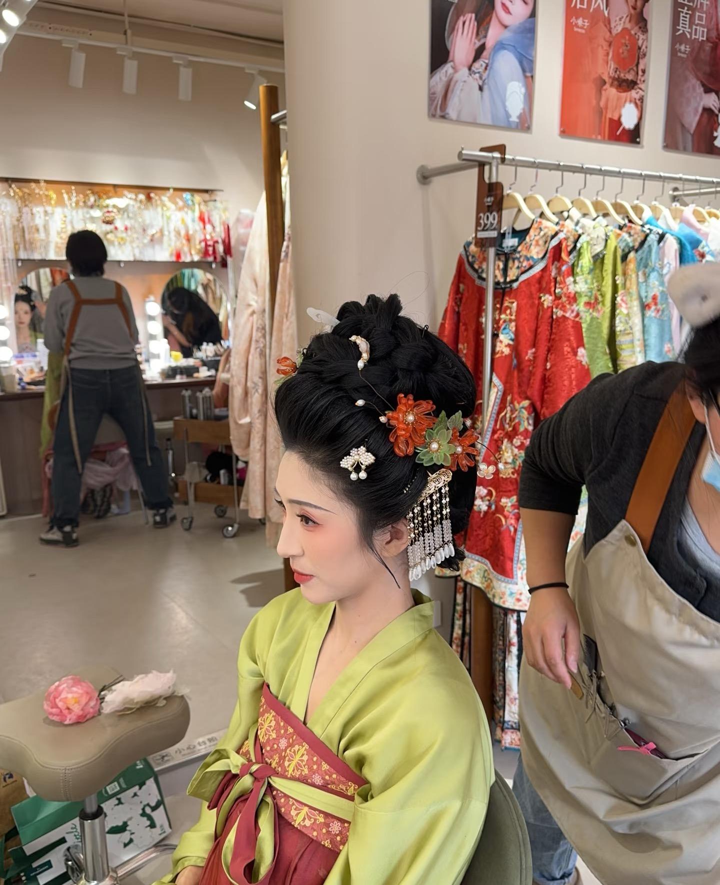 潮流之下,汉服体验更显多元化,“爆改”便是极具话题性的创新玩法。在洛阳的汉服妆造店里,“爆改”特指男生尝试女装汉服的沉浸式体验,通过妆容、发饰、服饰的全套改造,实现风格的颠覆性转变。
