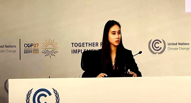 在一场关于气候变化的座谈会上,何超欣作为年轻代表发表了讲话。
