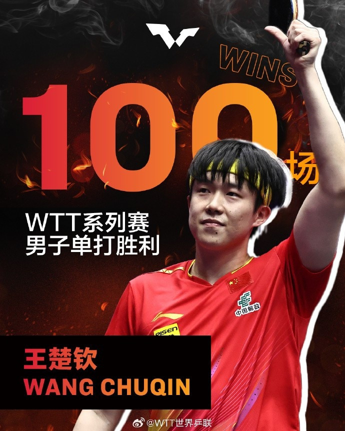 据统计,这是王楚钦在WTT系列赛的第100场单打胜利。