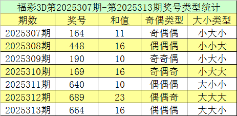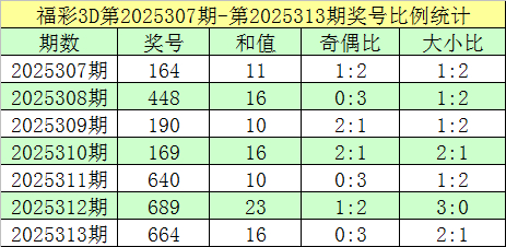 福彩3D第2025313期回顾:奖号为664,奖号奇偶比为0:3,大小比为2:1,和值为16,类型为组三。