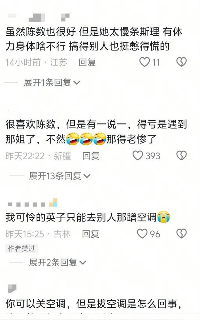 此外,作为团队中年龄较长的成员,陈数的体能明显跟不上节奏。在需要体力的活动中,她常常落在队伍后面,甚至被部分观众贴上“拖油瓶”的标签。