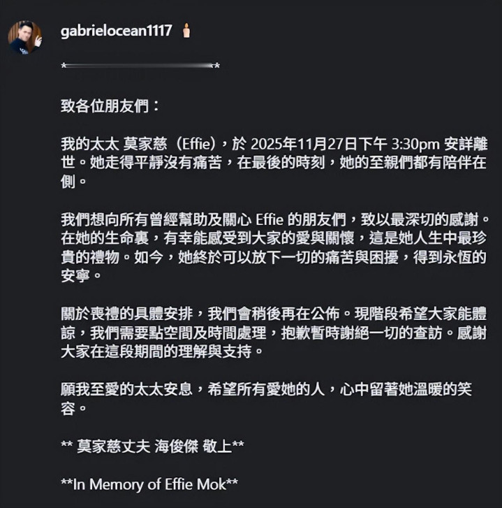 海俊杰今日(11月29日)在社交平台发文悼念亡妻,透露太太莫家慈于 2025年11月27日下午 3:30pm 在至亲陪伴下安详离世,而且平静没有痛苦。有关丧礼的具体安排,海俊杰表示会稍后再作公布。